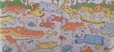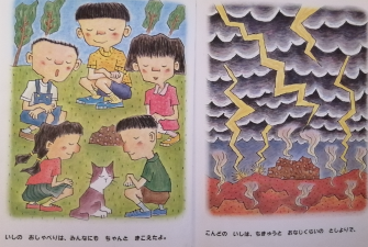 「なんまんびきもの きょうりゅうが わしの あたまの うえを あるいて いったんだぞ。」
